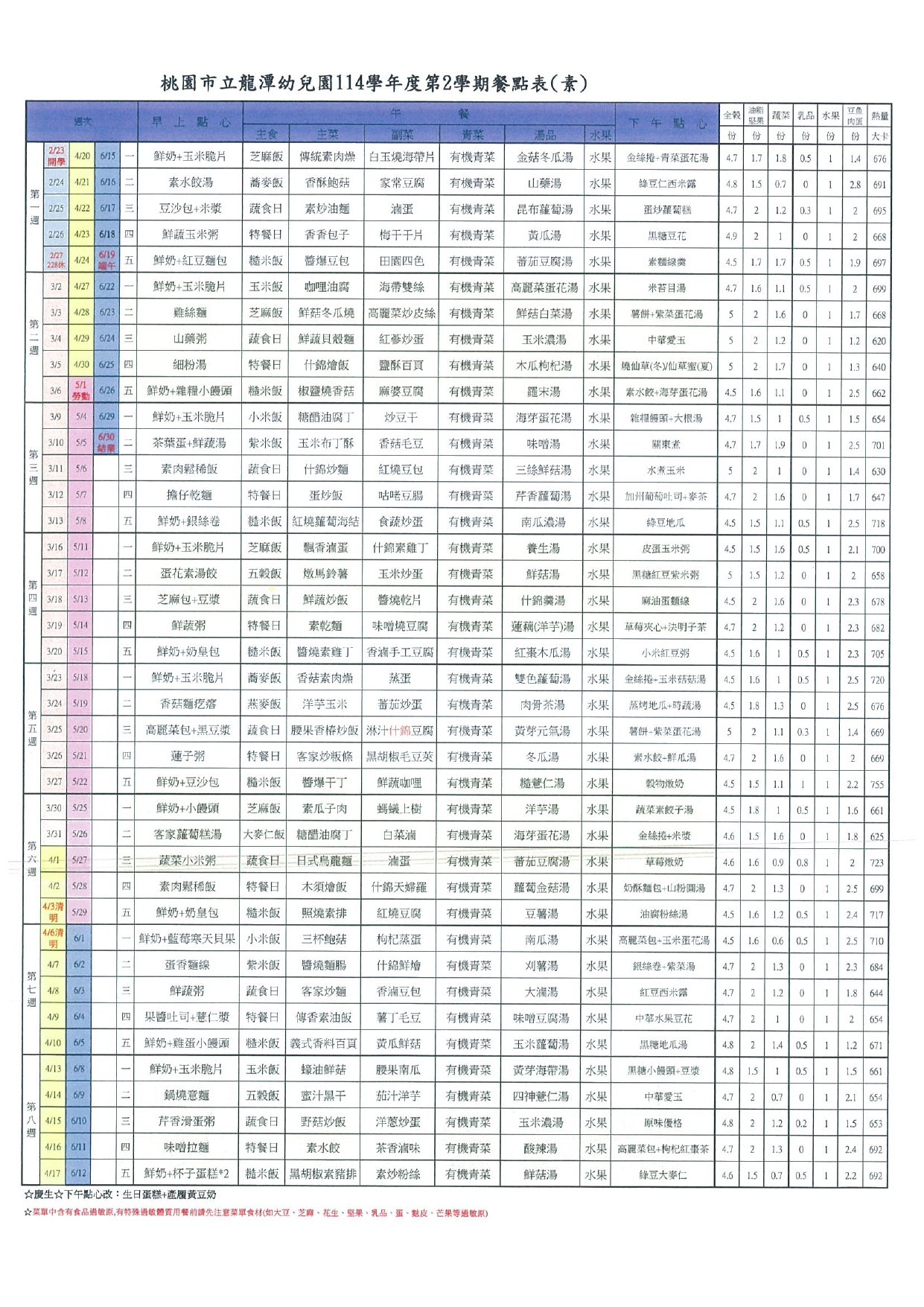 114第二學期素食菜單