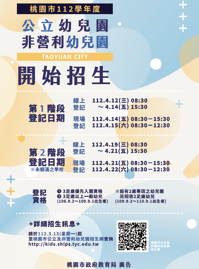 【招生缺額預計112年4月6日公告於桃園市公立及非營利幼兒園招生網】