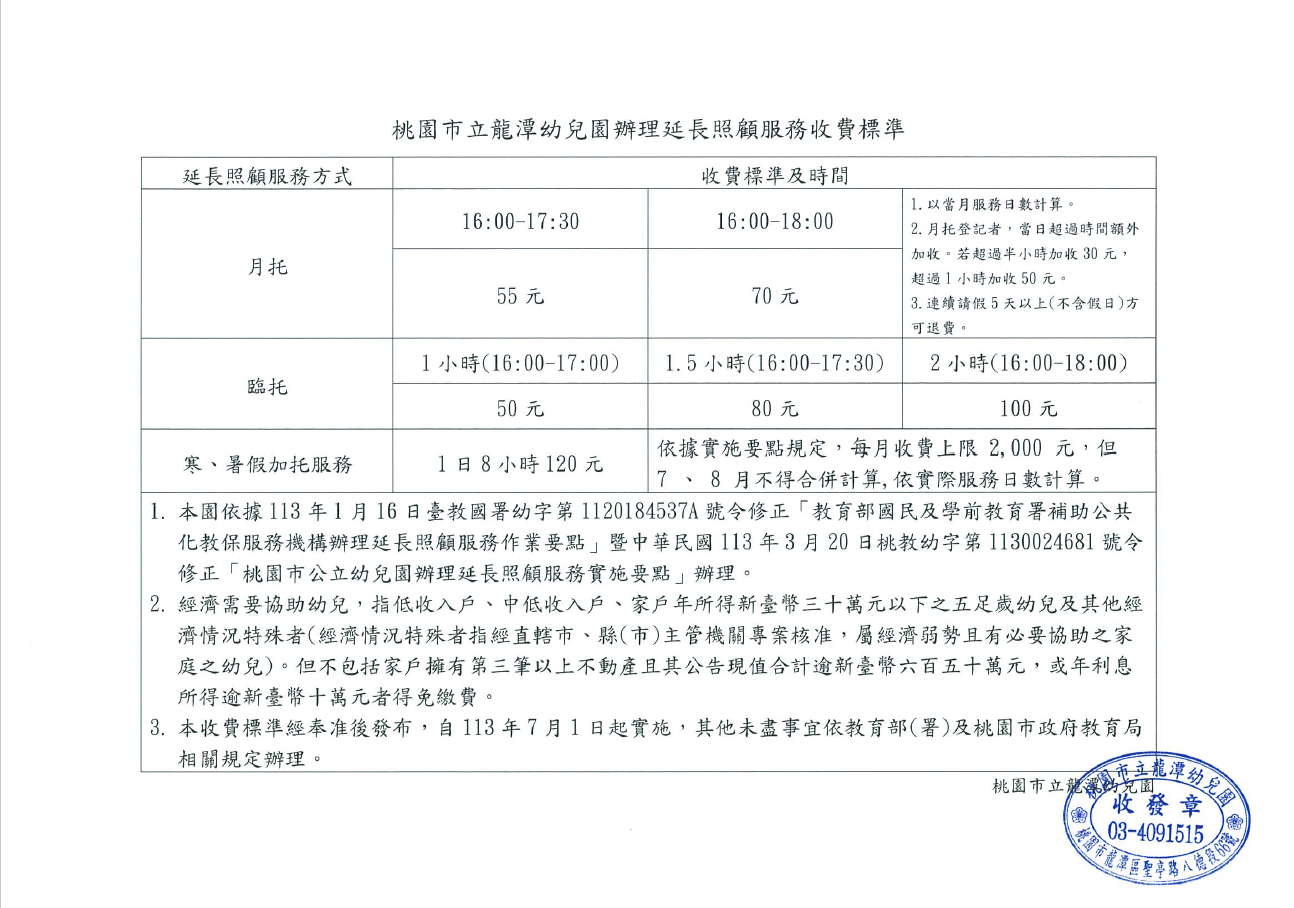 桃園市立龍潭幼兒園辦理延長照顧服務收費標準