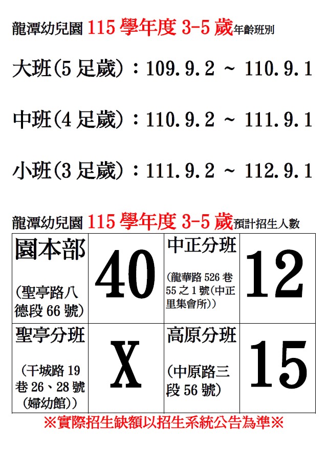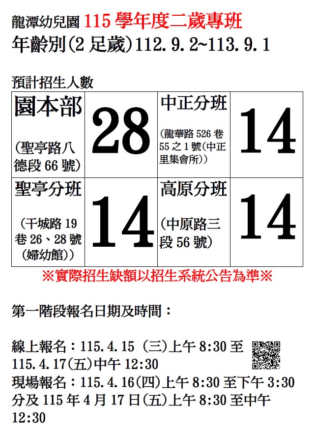 ※現場報名地點:龍潭幼兒園園本部辦公室(龍潭區聖亭路八德段66號)